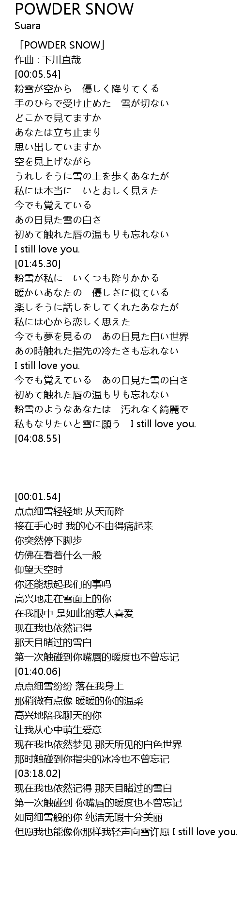 | [03:50.72] | 私もなりたいと雪に願う I still love you. |