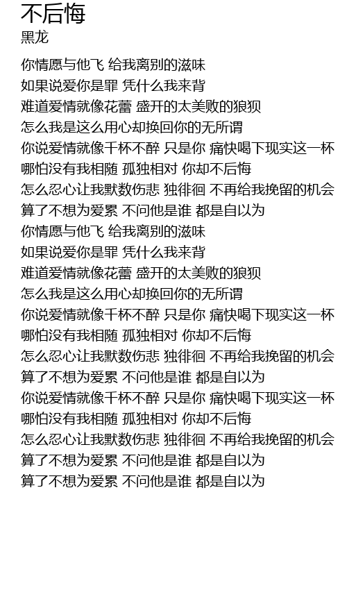 | [00:53.64] | nǎ pà méi yǒu wǒ xiāng suí gū dú xiāng duì nǐ què bù hòu huǐ |