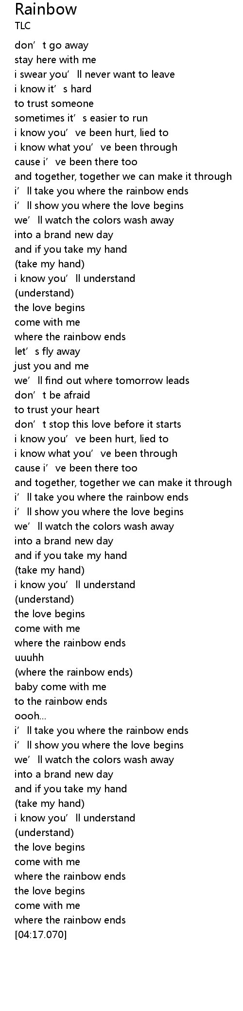 | [03:27.090] | i' ll take you where the rainbow ends |