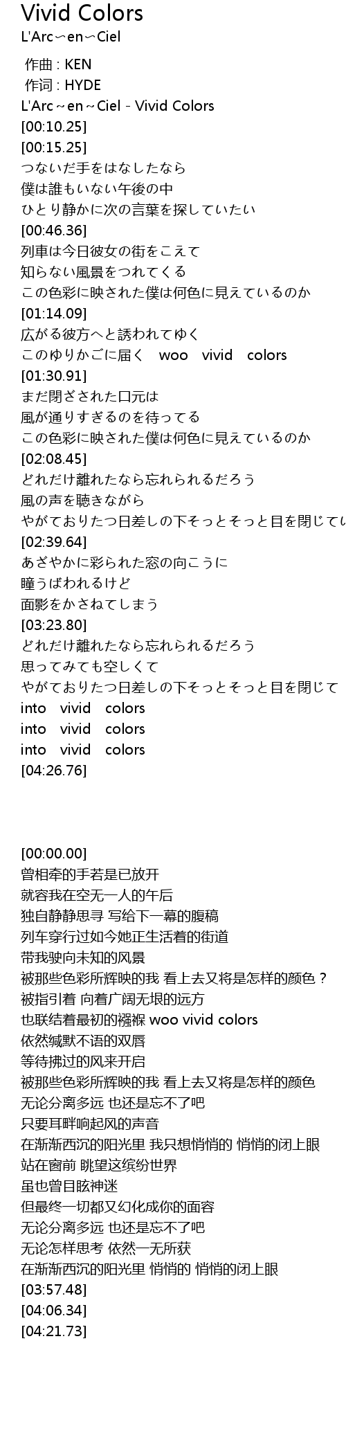 | [00:00.00] | L'Arc~en~Ciel - Vivid Colors |