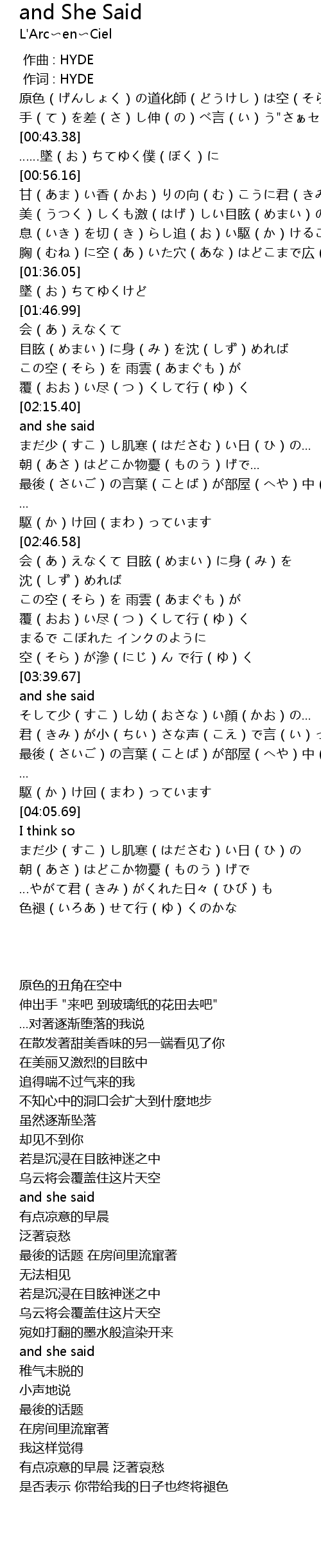 | [03:26.68] | まるで こぼれた インクのように 空(そら)が滲(にじ)ん で行(ゆ)く |