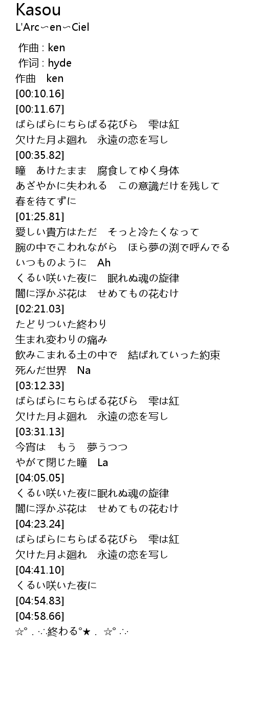 | [04:23.63] | ばらばらにちらばる花びら 雫は紅 |