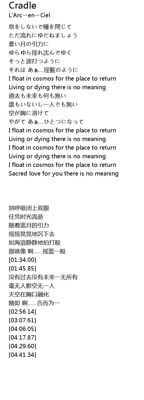 | [01:34.00] | I float in cosmos for the place to return |