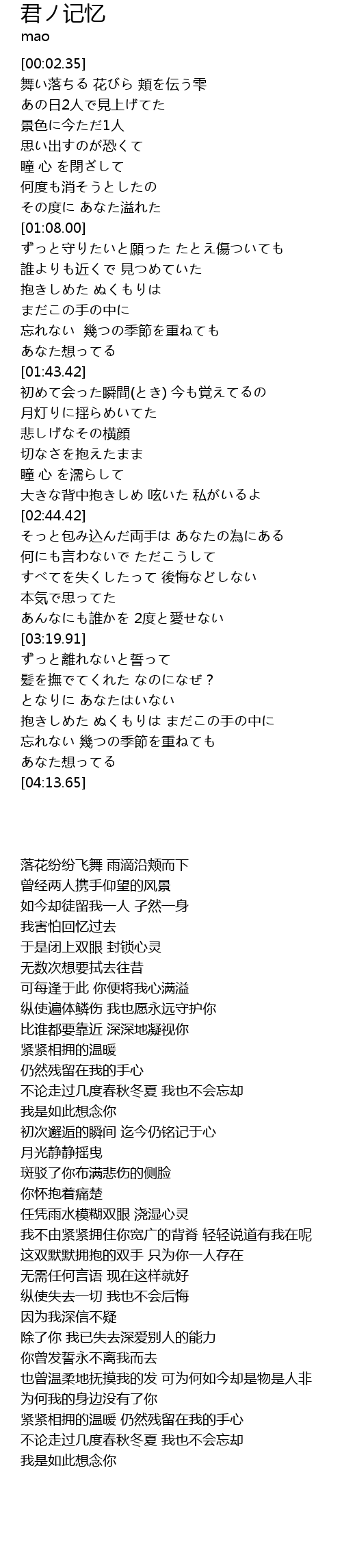 | [00:18.60] | 舞い落ちる 花びら 頬を伝う雫 |
