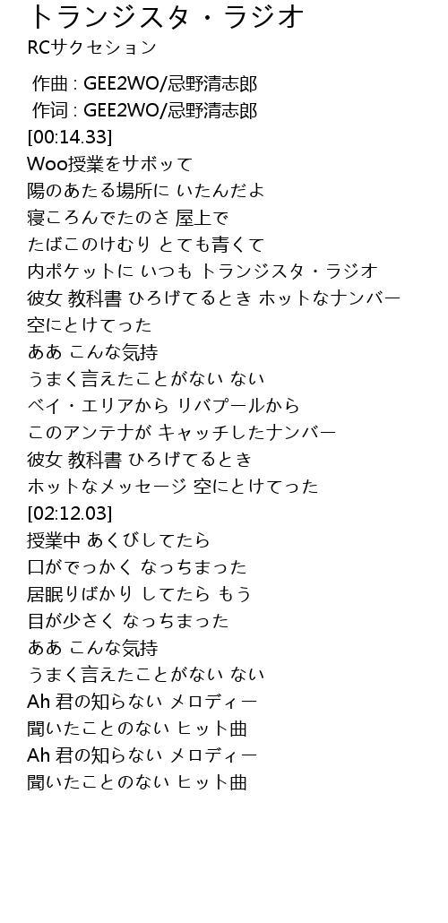 | [00:55.86] | 内ポケットに いつも トランジスタ・ラジオ |