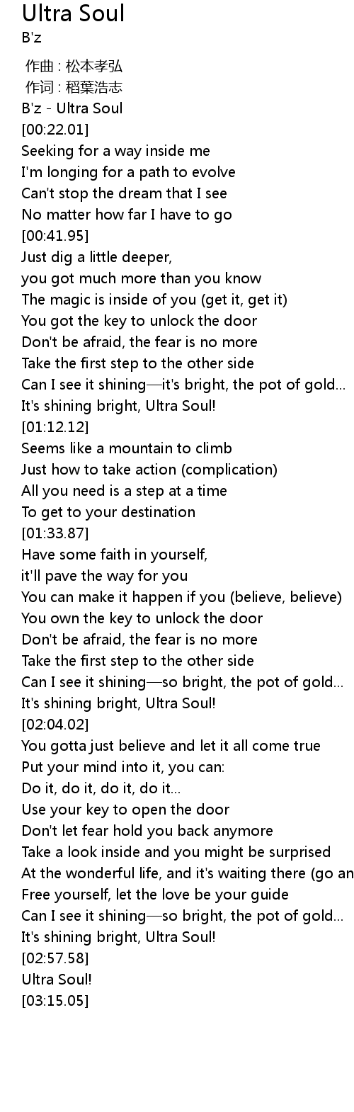 | [02:53.67] | It' s shining bright, Ultra Soul! |