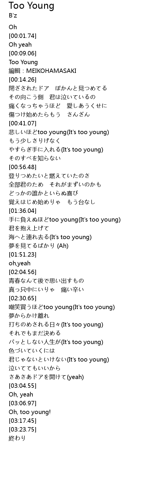 | [01:36.88] | 手に負えぬほどtoo young(It's too young) |