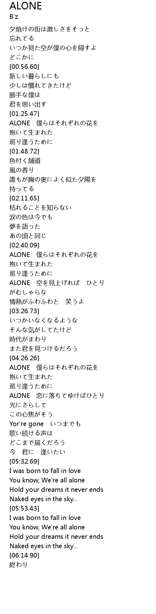 | [04:49.67] | ALONE 恋に落ちてゆけばひとり |