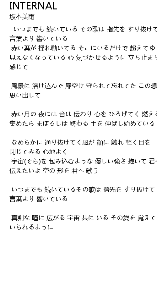 | いつまでも 続いている その歌は 指先を すり抜けて 言葉より 響いている | |