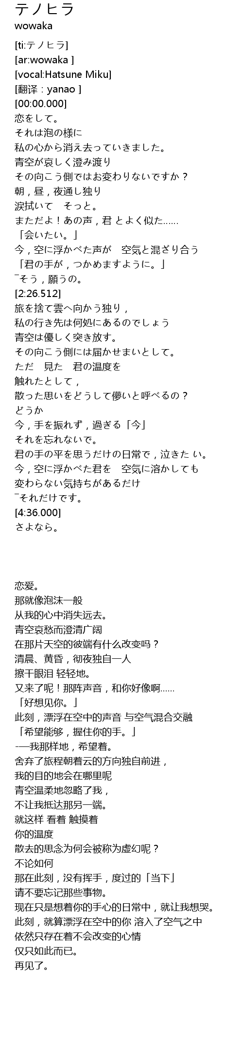 | [4:05.156] | 君の手の平を思うだけの日常で,泣きた い。 |