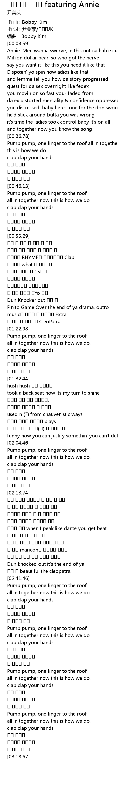 | [00:09.41] | Annie: Men wanna swerve, in this untouchable curve |