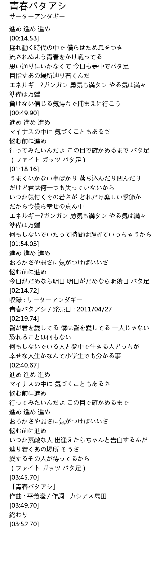| [02:16.74] | 収録∶サーターアンダギー - 青春バタアシ/発売日∶2011/04/27 |