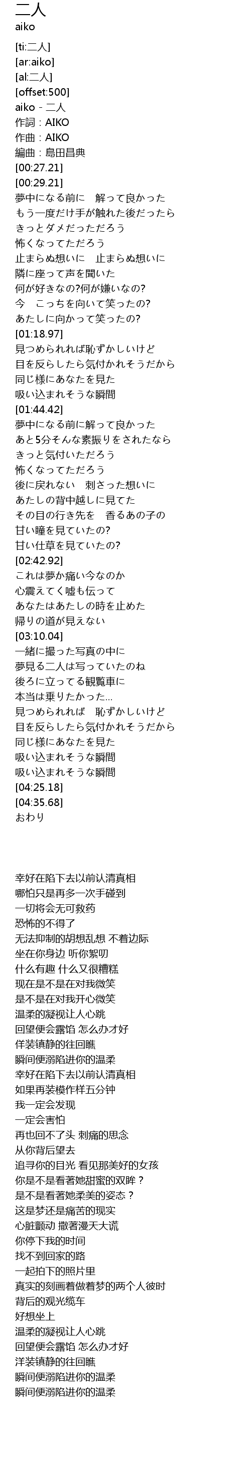 | [03:35.80] | 真实的刻画着做着梦的两个人彼时 |