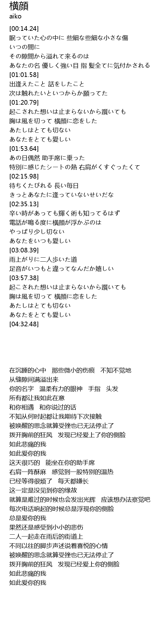| [01:30.93] | 拨开胸前的狂风 发现已经爱上了你的侧脸 |
