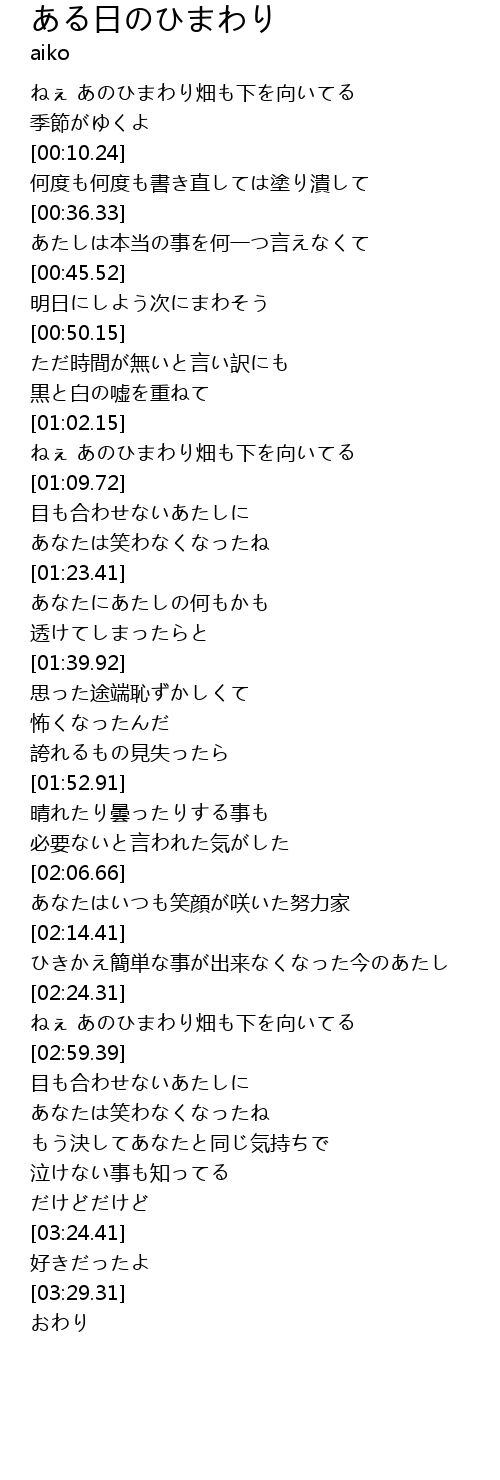 | [00:02.03] | ねぇ あのひまわり畑も下を向いてる |