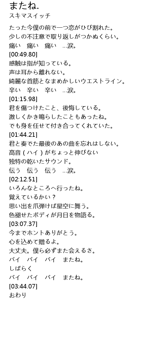 | [02:58.96] | 色褪せたボディが月日を物語る。 |