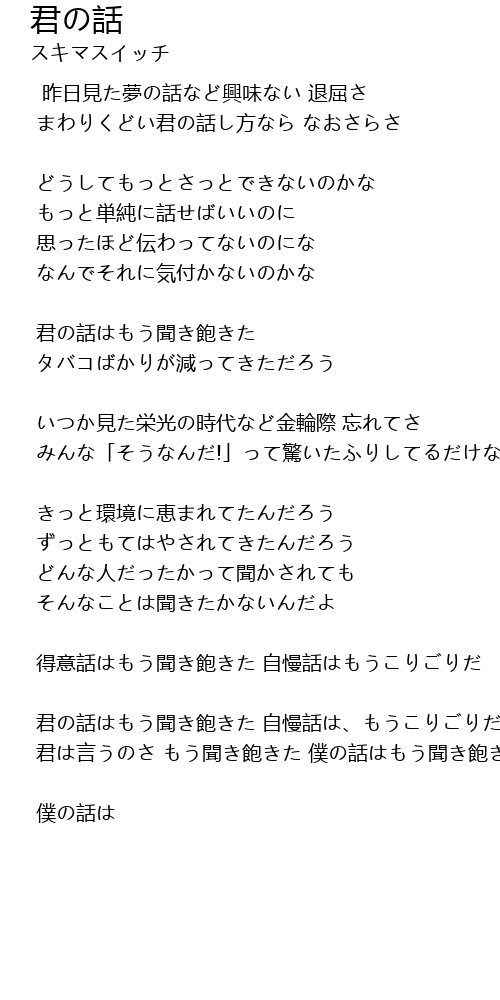 | 君は言うのさ もう聞き飽きた 僕の話はもう聞き飽きた | |