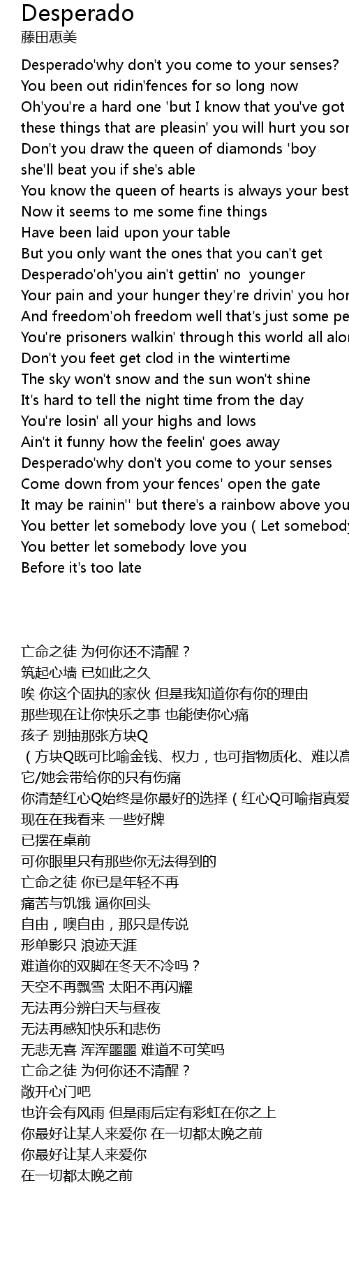 | [00:16.93] | Desperado' why don' t you come to your senses? |