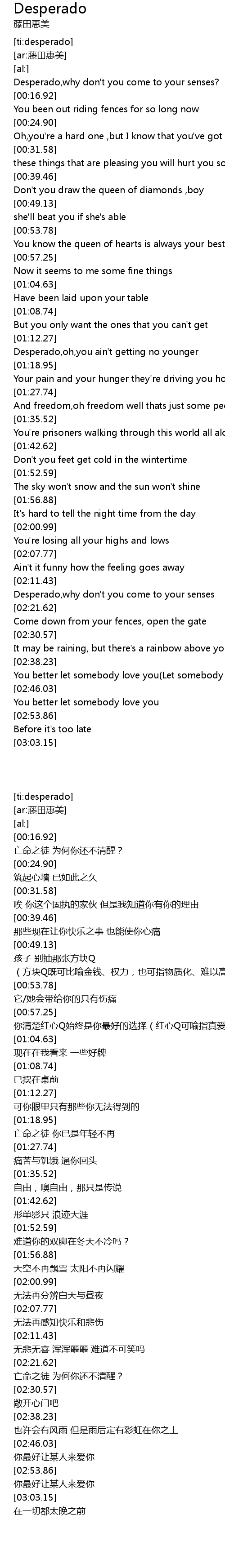 | [02:21.62] | Desperado,why don't you come to your senses |