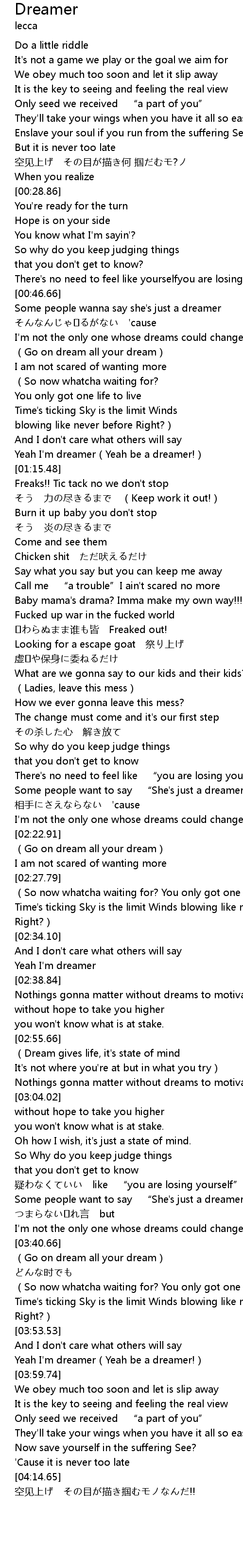 | [03:58.19] | Yeah I' m dreamer Yeah be a dreamer! |