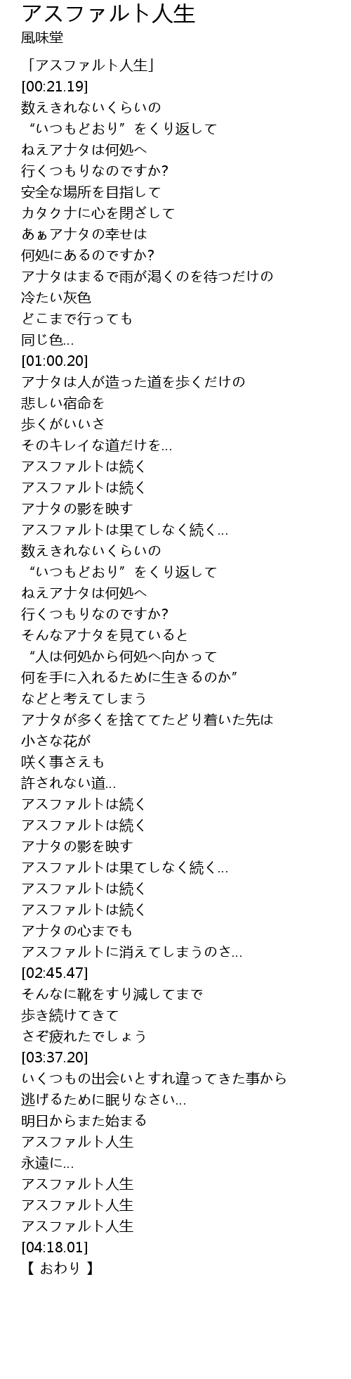 | [00:01.19] | 「アスファルト人生」 |