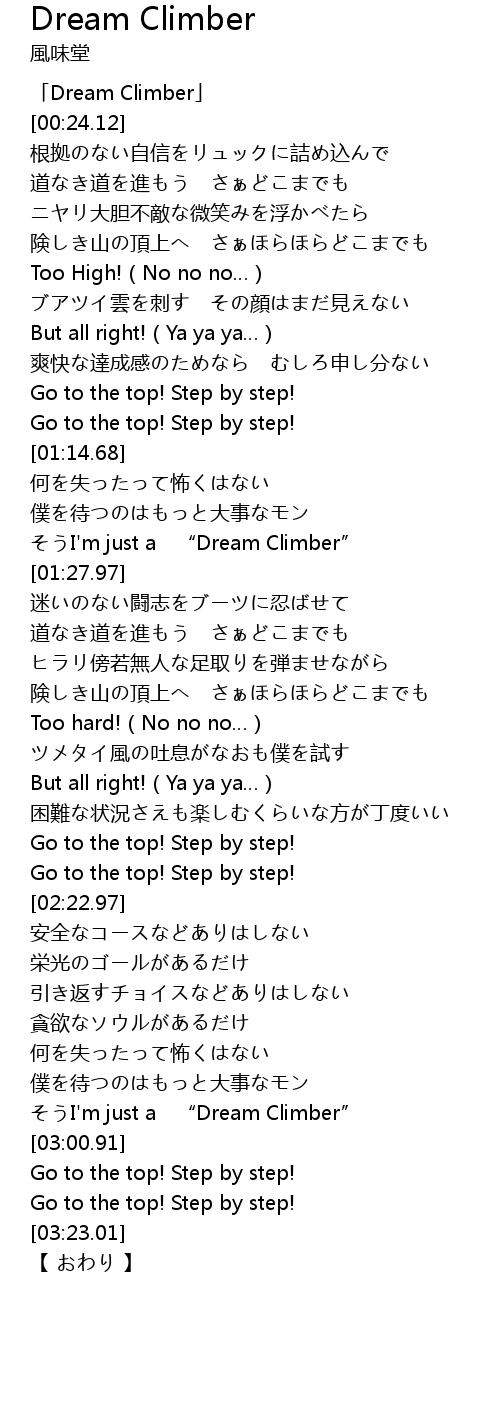 | [01:23.36] | そうI'm just a “Dream Climber” |