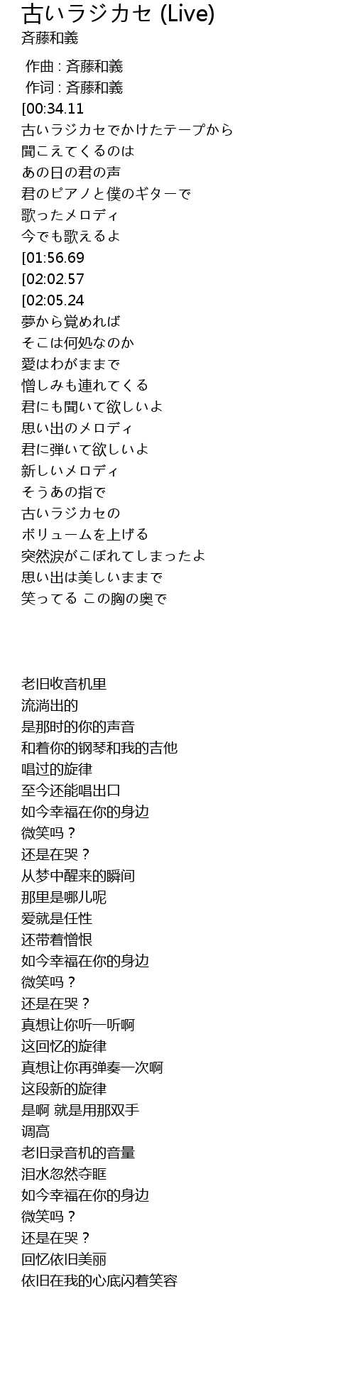 | [01:15.73][02:02.57][03:24.09] | 笑ってる? |