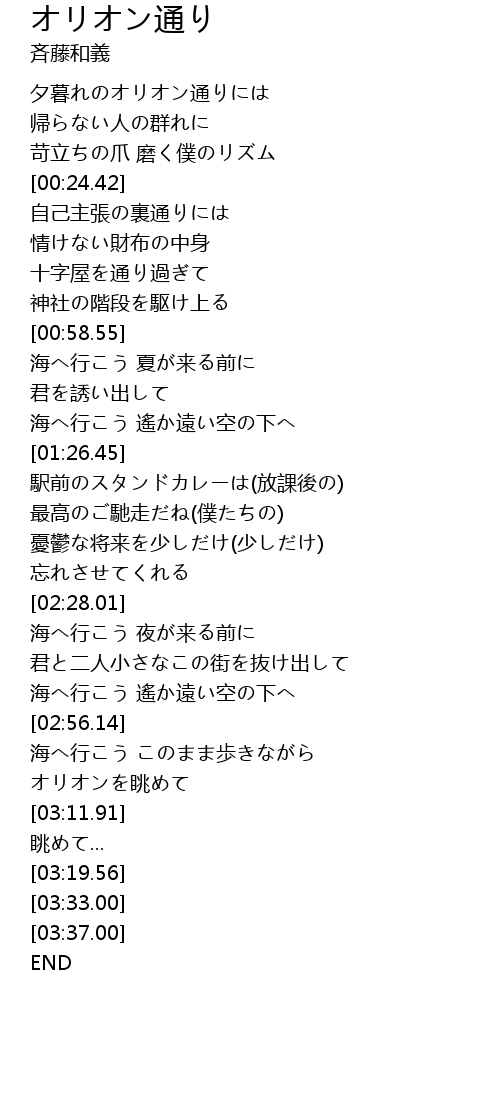 | [00:00.90] | 夕暮れのオリオン通りには |