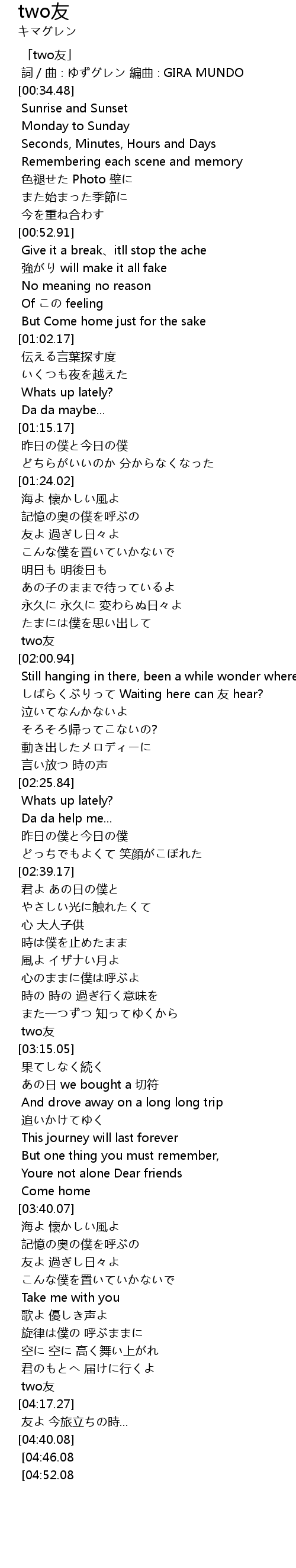 | [02:11.48] | しばらくぶりって Waiting here can 友 hear? |