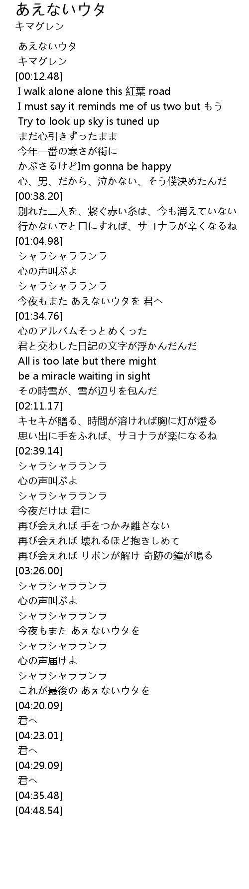 | [03:16.53] | 再び会えれば リボンが解け 奇跡の鐘が鳴る |
