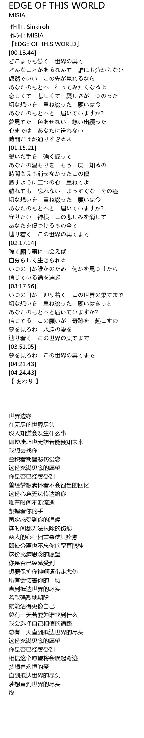 | [03:22.29] | いつの日か 辿り着く この世界の果てまで |