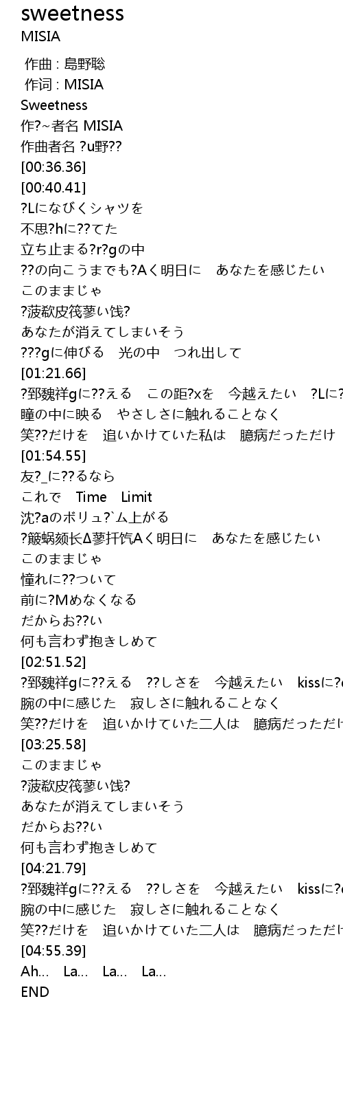 | [00:20.90] | 作?~者名 MISIA |