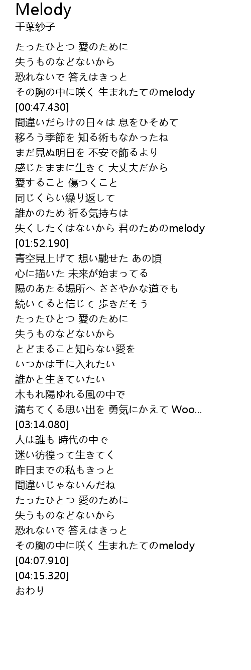| [03:57.230] | その胸の中に咲く 生まれたてのmelody |
