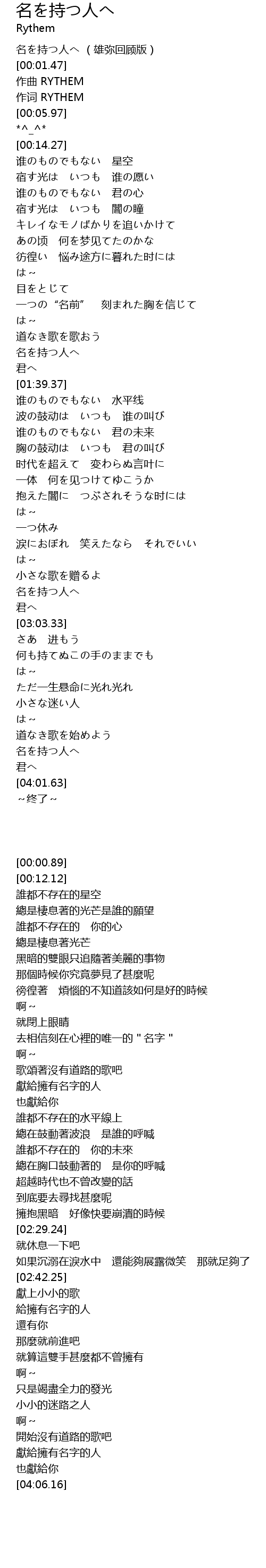 | [00:00.89] | 名を持つ人へ (雄弥回顾版) |