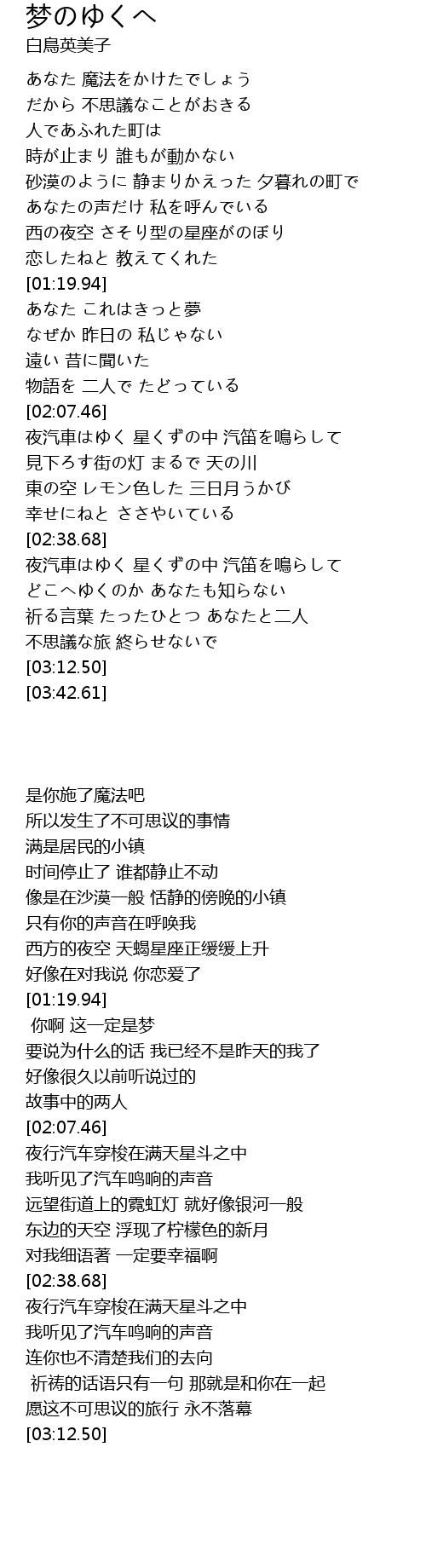 | [02:40.72] | 夜汽車はゆく 星くずの中 汽笛を鳴らして |