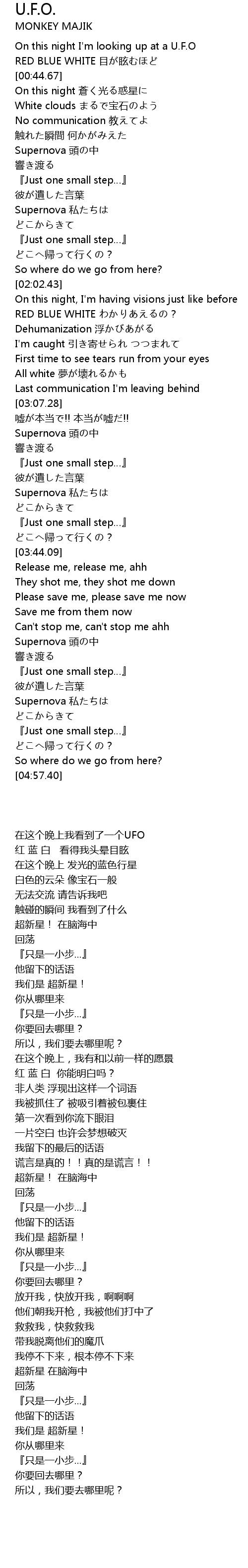 | [00:29.54] | On this night I' m looking up at a U. F. O |