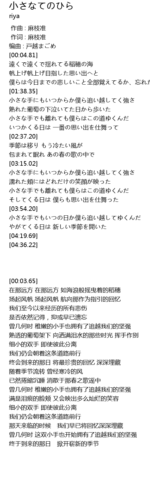 | [03:54.21] | 小さな手でもいつの日か僕ら追い越してゆくんだ |