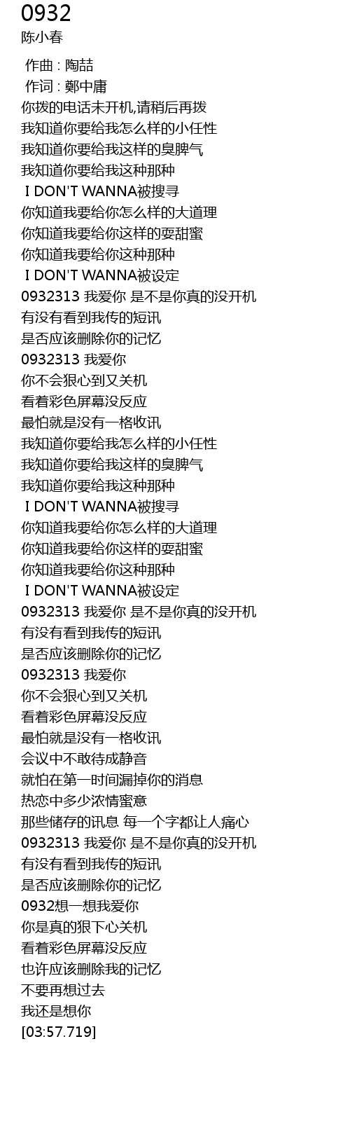 | [03:11.789] | 0932313 我爱你 是不是你真的没开机 |