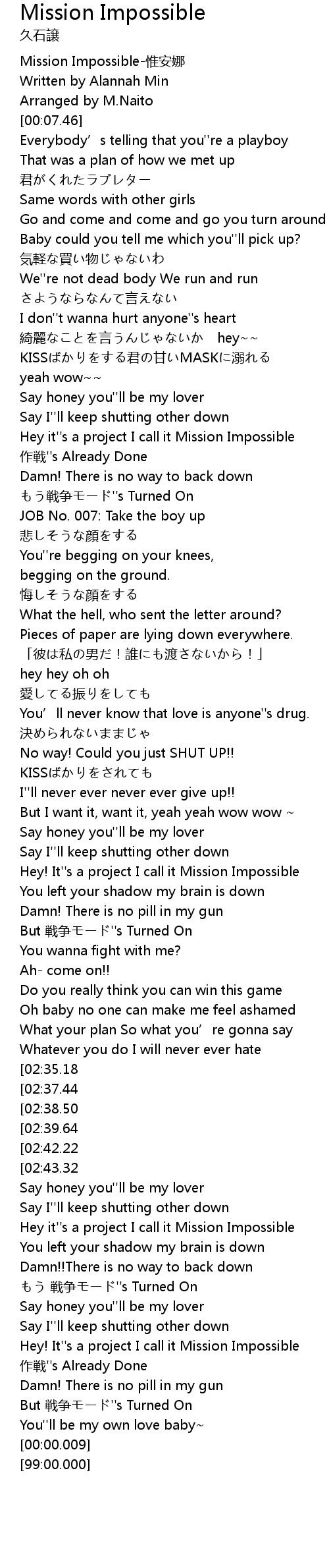 | [03:20.65] | Hey! It''s a project I call it Mission Impossible |
