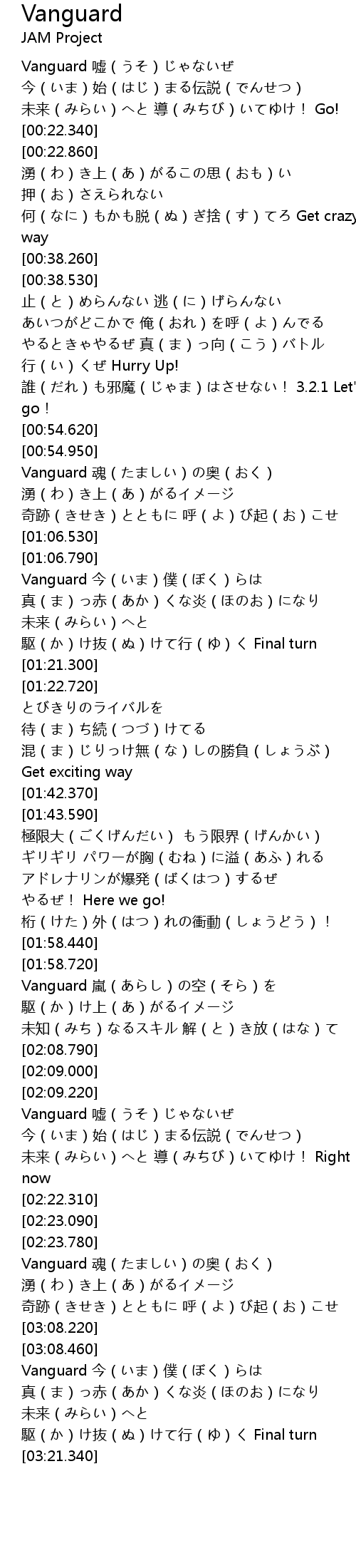 | [00:06.350] | Vanguard 嘘(うそ)じゃないぜ 今(いま)始(はじ)まる伝説(でんせつ) |