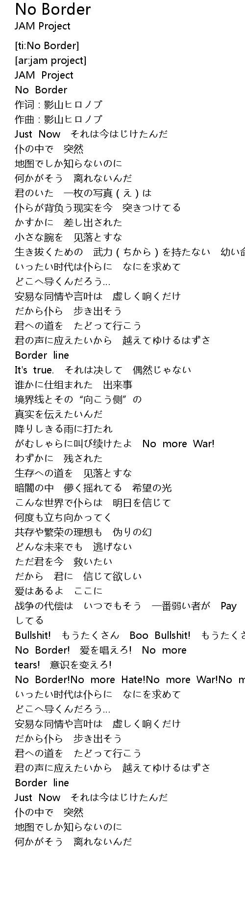 | [03:36.10] | No Border! No more Hate! No more War! No more Kill! |