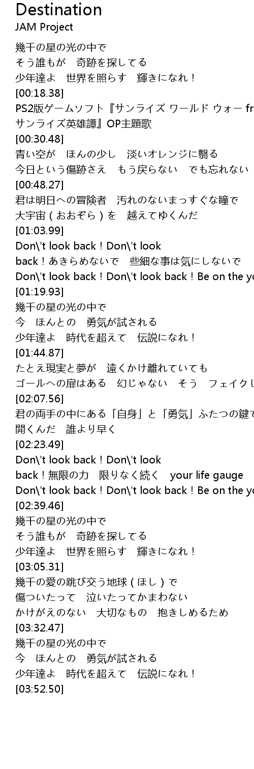 | [02:23.81] | Don\'t look back!Don\'t look back!無限の力 限りなく続く your life gauge |