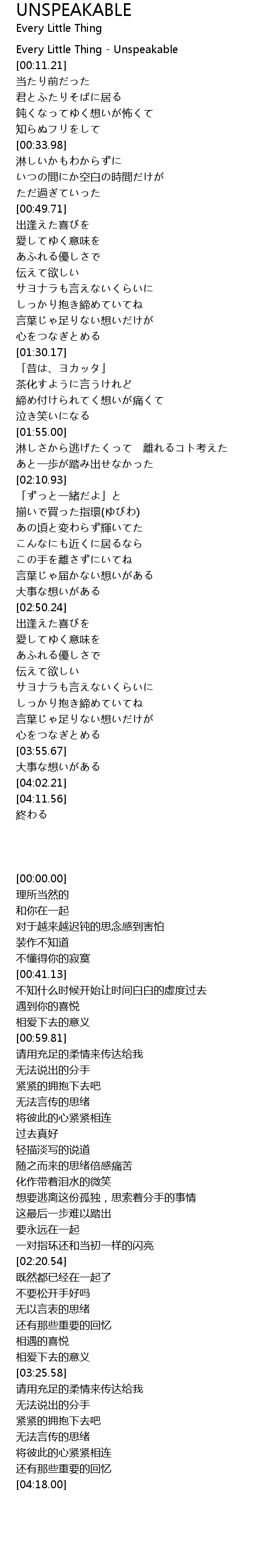 | [00:00.00] | Every Little Thing - Unspeakable |