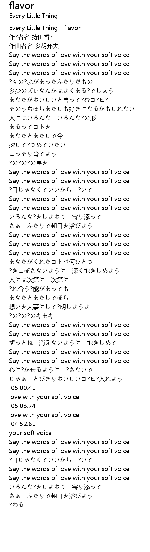 | [05:14.79][05:00.41][04:45.50][04:31.00][04:16.39][03:25.44] | Say the words of love with your soft voice |