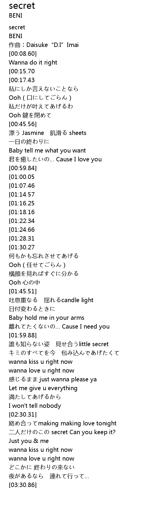 | [02:38.71] | 二人だけのこの secret Can you keep it? |