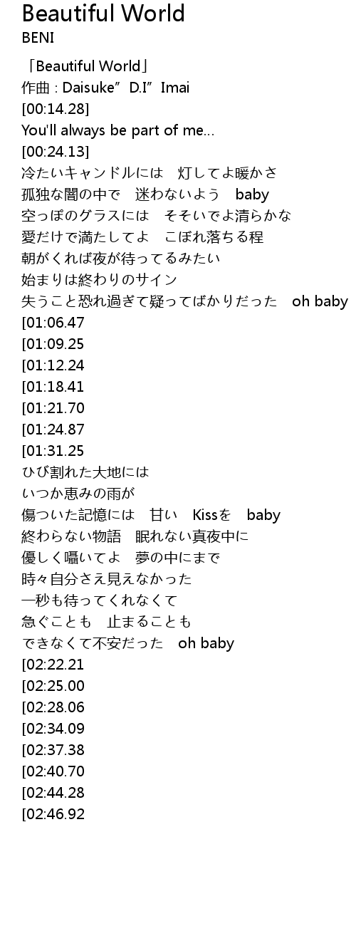 | [03:40.82][01:21.70] | hui Beautiful world |