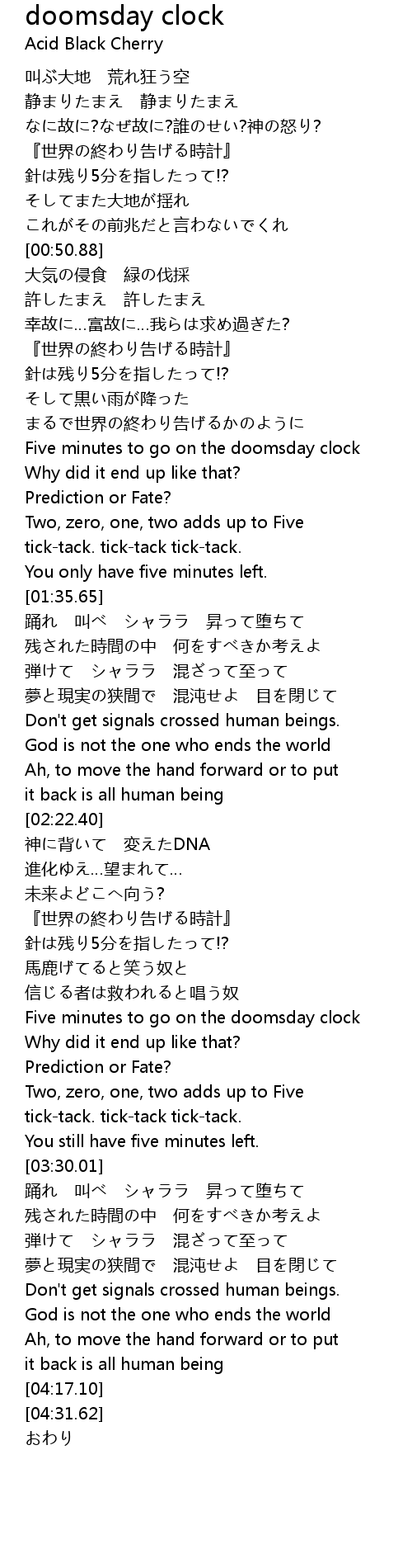 | [03:18.82] | Five minutes to go on the doomsday clock |