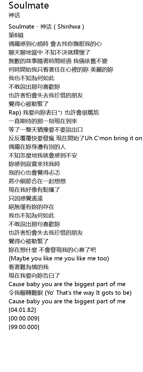 | [00:00.00] | Soulmate - 神话(Shinhwa) |