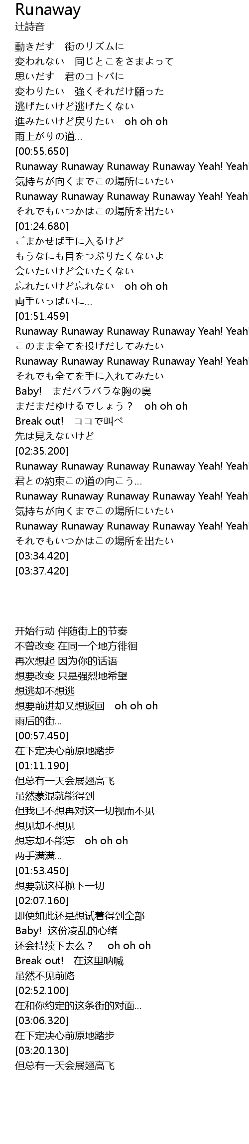| [03:20.130] | Runaway Runaway Runaway Runaway Yeah! Yeah! |
