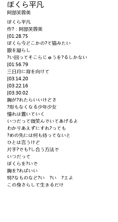 | [00:11.00][01:28.75][02:59.20][04:02.92] | 阿部芙蓉美-ぼくら平凡 |